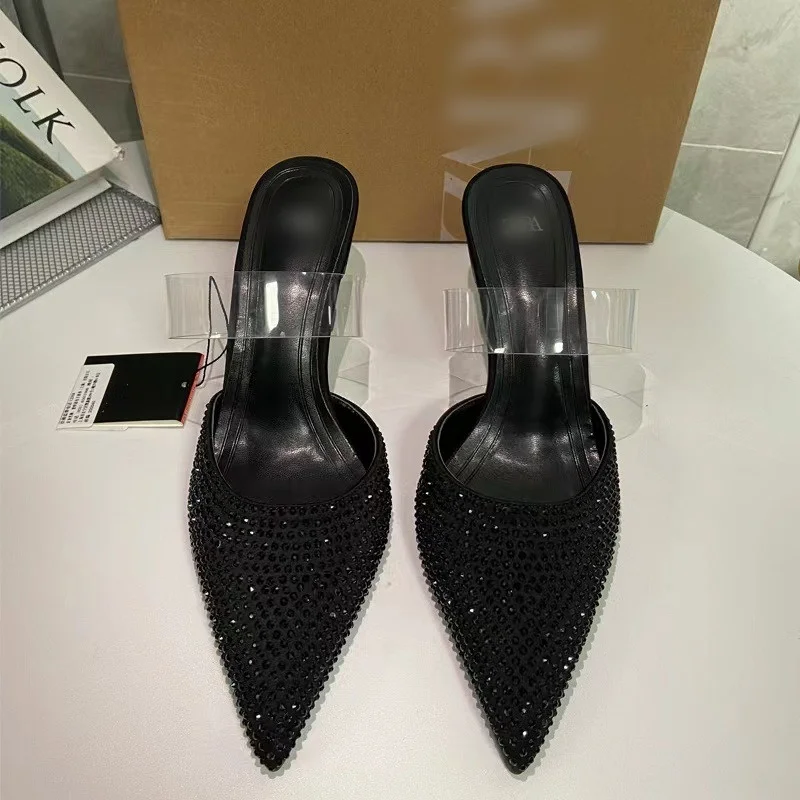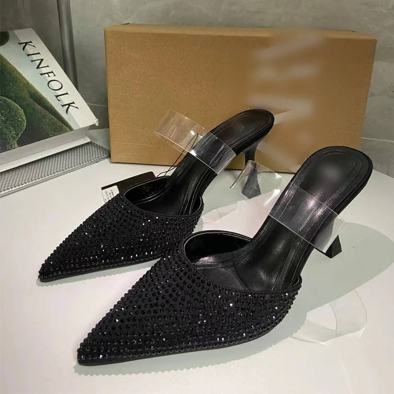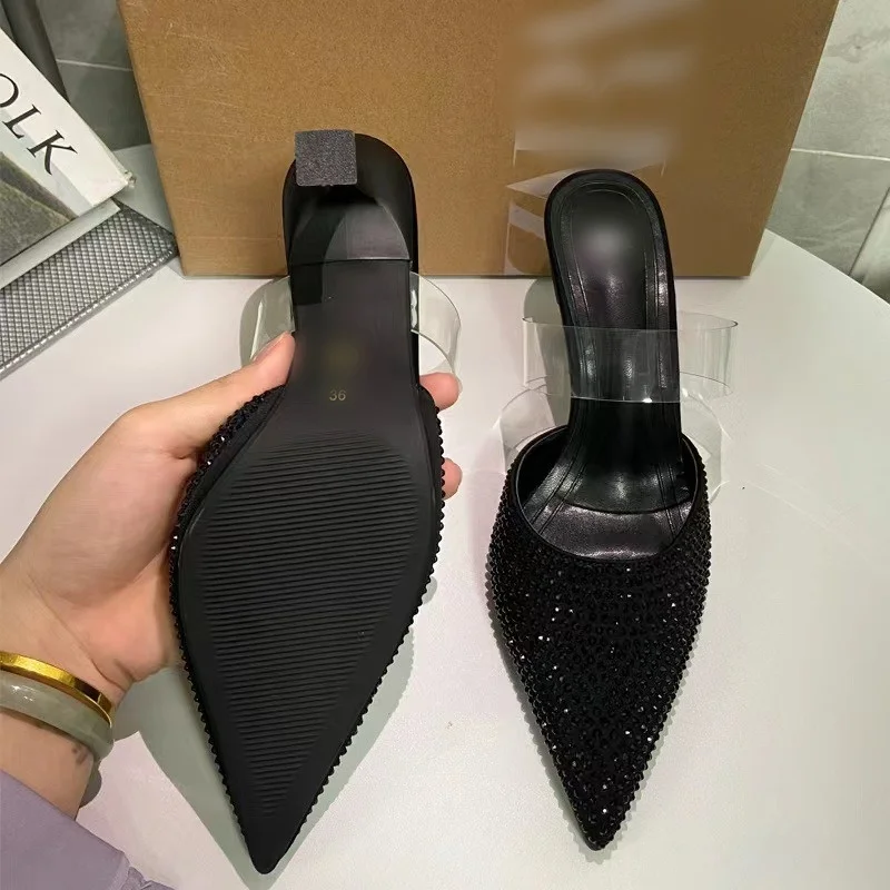 QuiteS 2026 Summer Diamond Shallow Mouth High Heels Black Back Strap Slingback Pointy Heel Sandals Women's Slip on Slippers